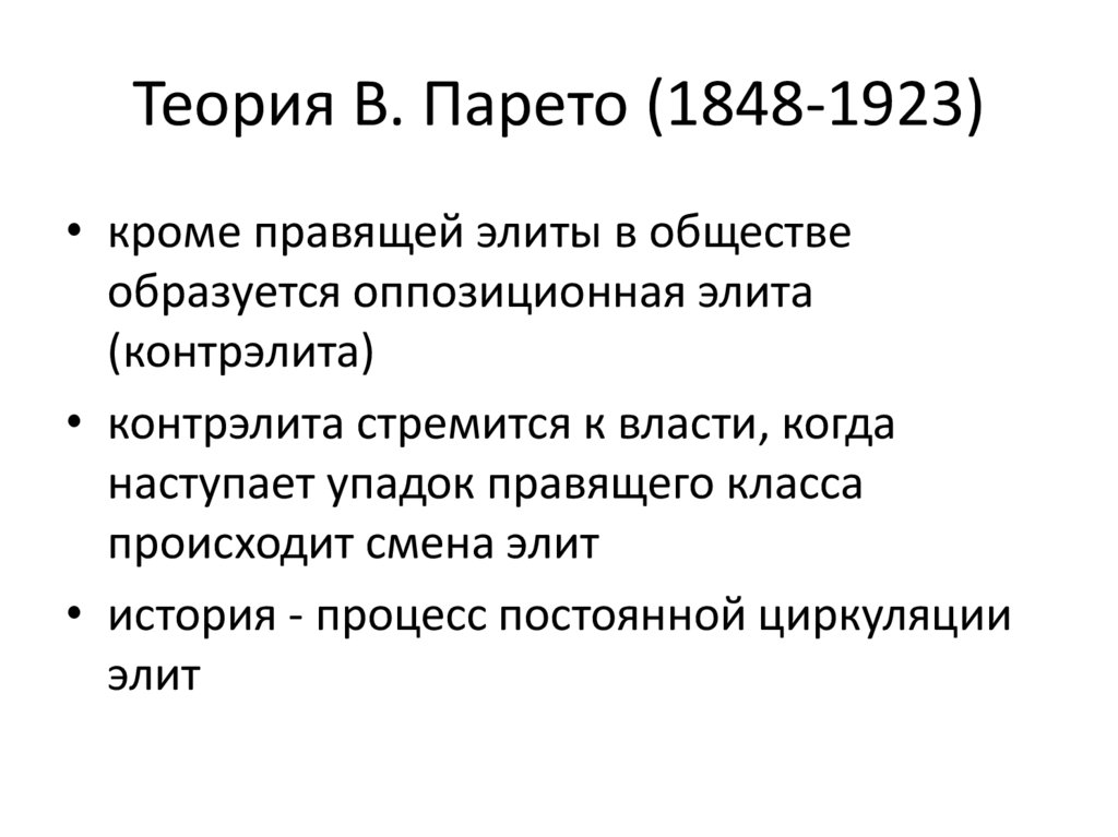Теория В. Парето (1848-1923)• кроме правящей элиты в обществе