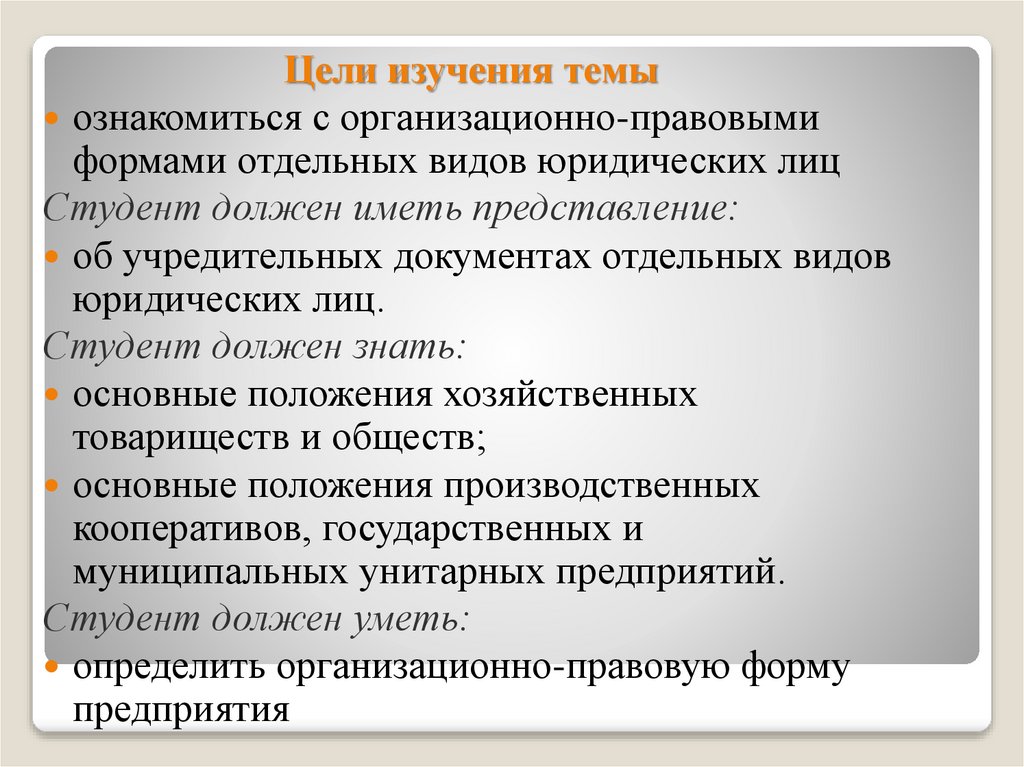 Цели изучения темыознакомиться с организационно-правовыми