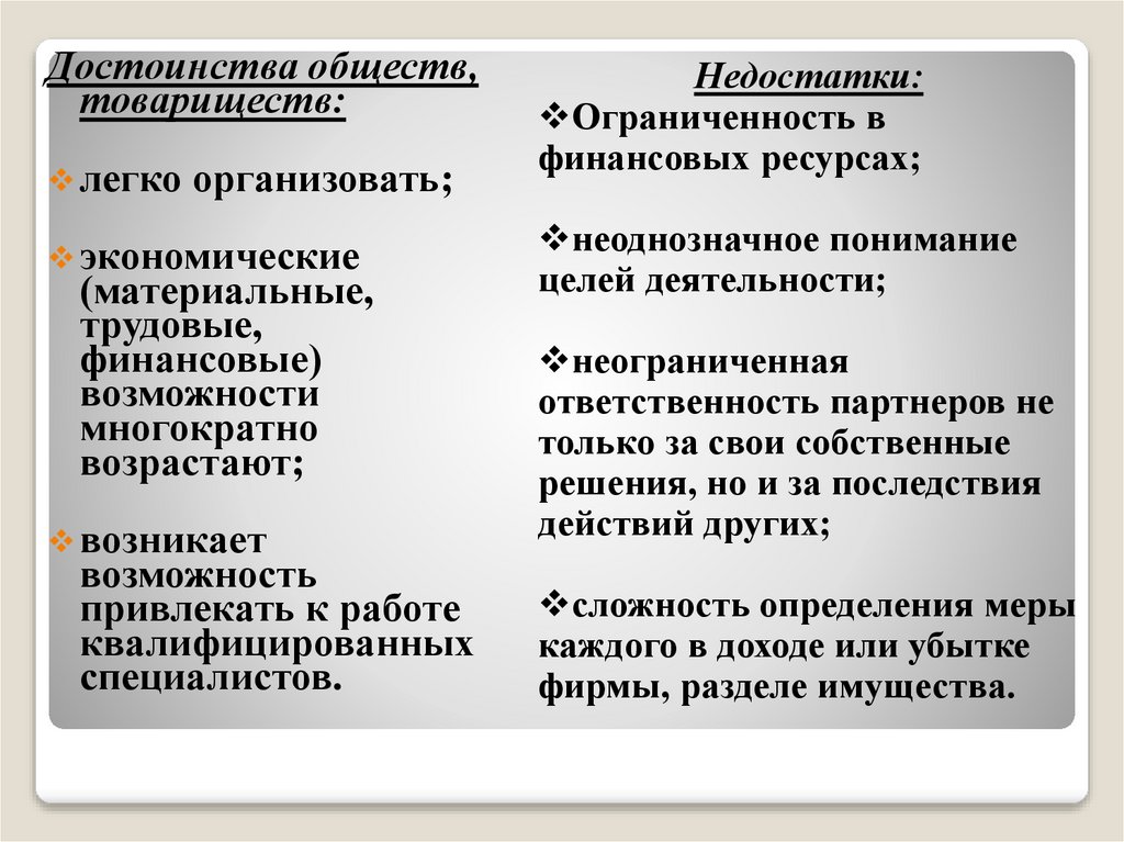 Достоинства обществ,товариществ: