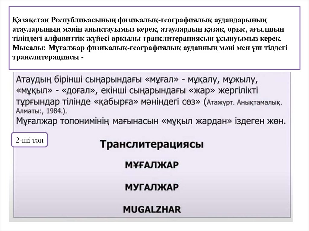 Мысалы: Мұғалжар физикалық-географиялық ауданның мәні мен үш тілдегі