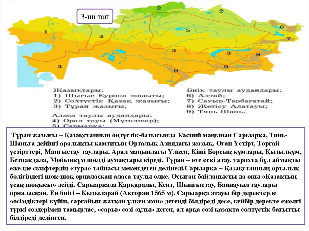 3-ші топТұран жазығы – Қазақстанның оңтүстік-батысында Каспий маңынан Сарыарқа, ТяньШаньға дейінгі аралықты қамтитын Орталық Азиядағы жазық. Оған Үстірт, Торғай