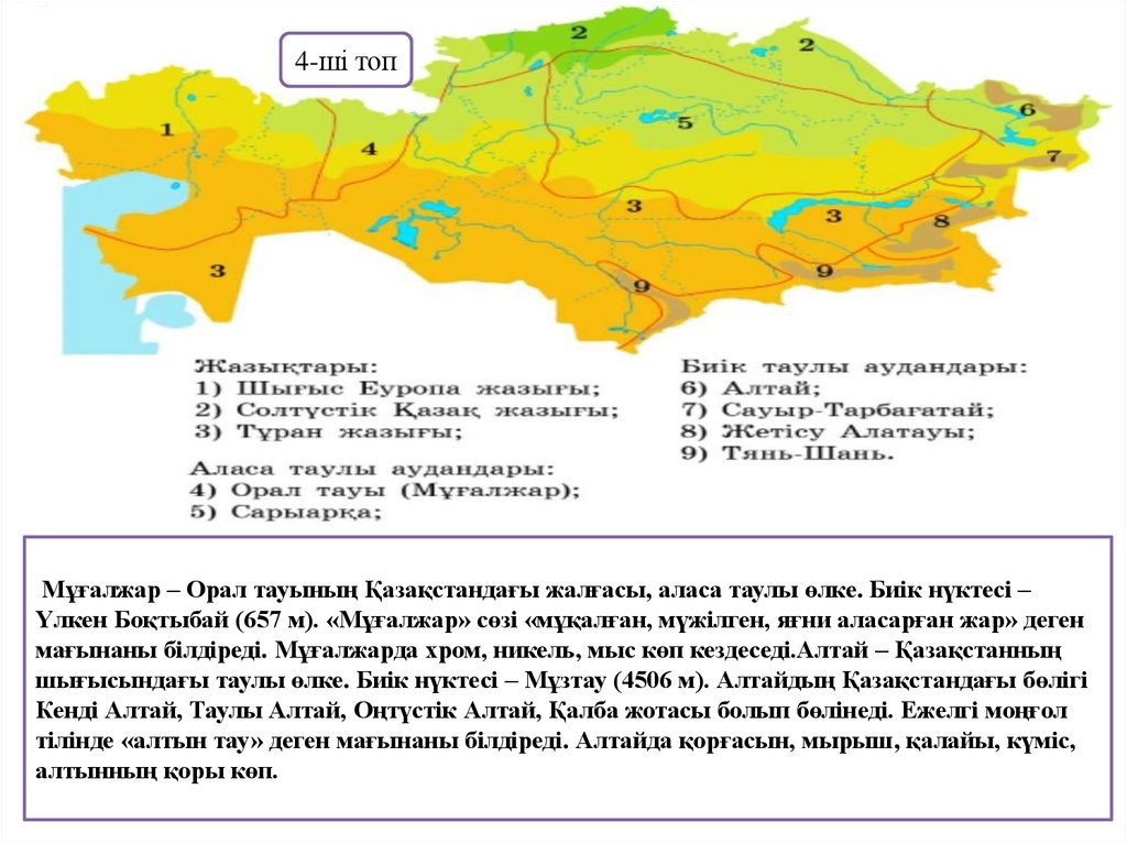 4-ші топМұғалжар – Орал тауының Қазақстандағы жалғасы, аласа таулы өлке. Биік нүктесі –