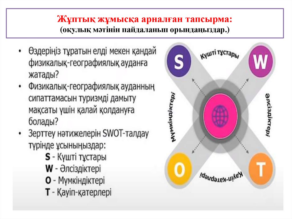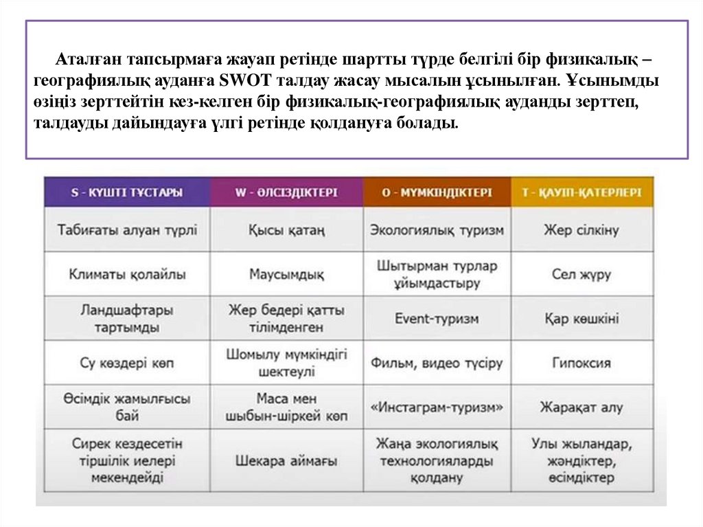 Аталған тапсырмаға жауап ретінде шартты түрде белгілі бір физикалық –географиялық ауданға SWOT талдау жасау мысалын ұсынылған. Ұсынымды