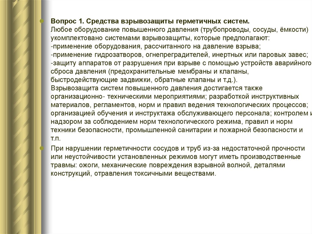 Вопрос 1. Средства взрывозащиты герметичных систем.Любое оборудование повышенного давления (трубопроводы, сосуды, ёмкости)