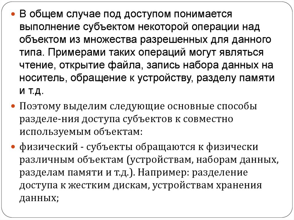 В общем случае под доступом понимаетсявыполнение субъектом некоторой операции над