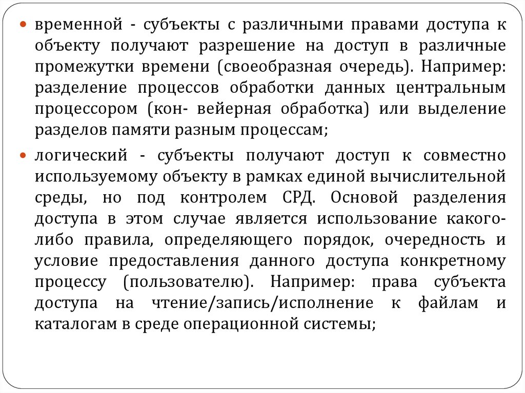 временной - субъекты с различными правами доступа кобъекту получают разрешение на доступ в различные