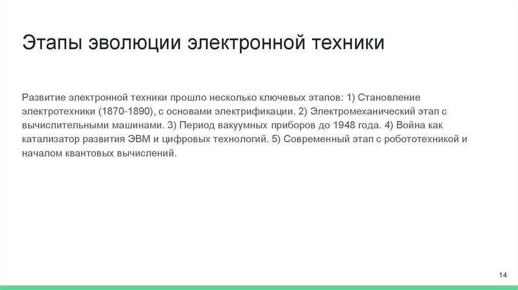Этапы эволюции электронной техникиРазвитие электронной техники прошло несколько ключевых этапов: 1) Становление