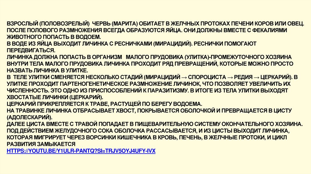 ВЗРОСЛЫЙ (ПОЛОВОЗРЕЛЫЙ) ЧЕРВЬ (МАРИТА) ОБИТАЕТ В ЖЕЛЧНЫХ ПРОТОКАХ ПЕЧЕНИ КОРОВ ИЛИ ОВЕЦ.ПОСЛЕ ПОЛОВОГО РАЗМНОЖЕНИЯ ВСЕГДА ОБРАЗУЮТСЯ ЯЙЦА. ОНИ ДОЛЖНЫ ВМЕСТЕ С ФЕКАЛИЯМИ