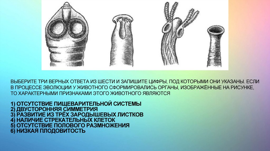 ВЫБЕРИТЕ ТРИ ВЕРНЫХ ОТВЕТА ИЗ ШЕСТИ И ЗАПИШИТЕ ЦИФРЫ, ПОД КОТОРЫМИ ОНИ УКАЗАНЫ. ЕСЛИВ ПРОЦЕССЕ ЭВОЛЮЦИИ У ЖИВОТНОГО СФОРМИРОВАЛИСЬ ОРГАНЫ, ИЗОБРАЖЁННЫЕ НА РИСУНКЕ,