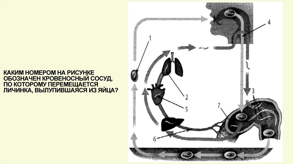 1) поступление личинки с током крови в сердце