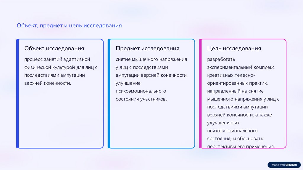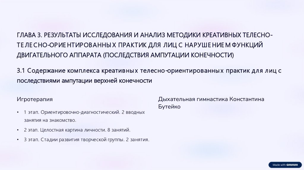 ГЛАВА 3. РЕЗУЛЬТАТЫ ИССЛЕДОВАНИЯ И АНАЛИЗ МЕТОДИКИ КРЕАТИВНЫХ ТЕЛЕСНОТЕ ЛЕ СНО-ОР ИЕ НТИРОВ АННЫ Х ПРАКТИК ДЛЯ ЛИЦ С НАРУШЕ НИЕ М ФУНКЦИЙДВИГАТЕЛЬНОГО АППАРАТА (ПОСЛЕДСТВИЯ АМПУТАЦИИ КОНЕЧНОСТИ)