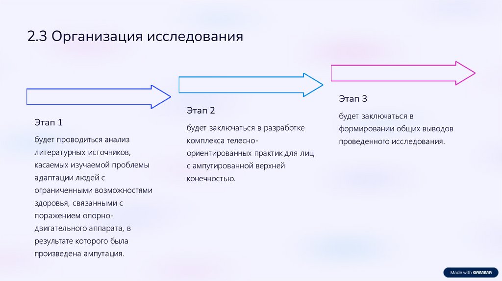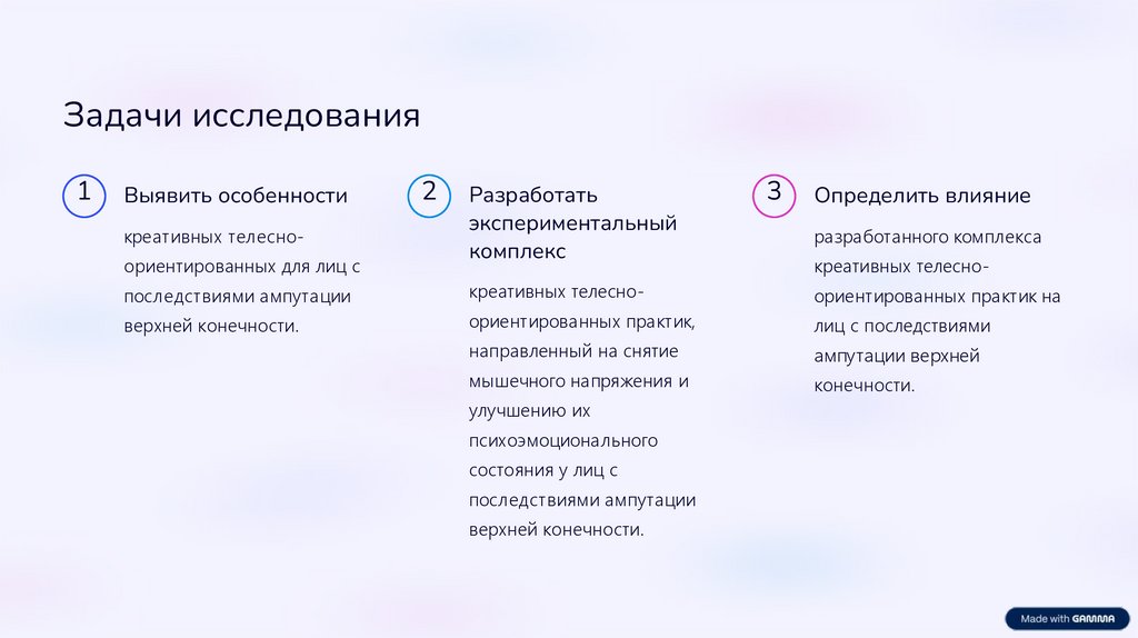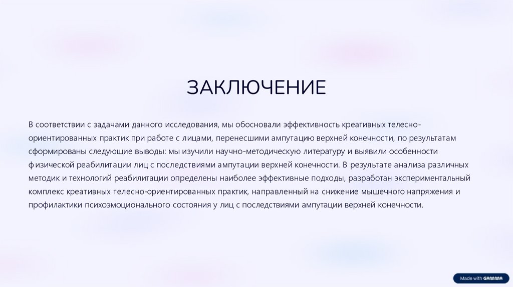 ЗАКЛЮЧЕНИЕВ соответствии с задачами данного исследования, мы обосновали эффективность креативных телесноориентированных практик при работе с лицами, перенесшими ампутацию верхней конечности, по результатам