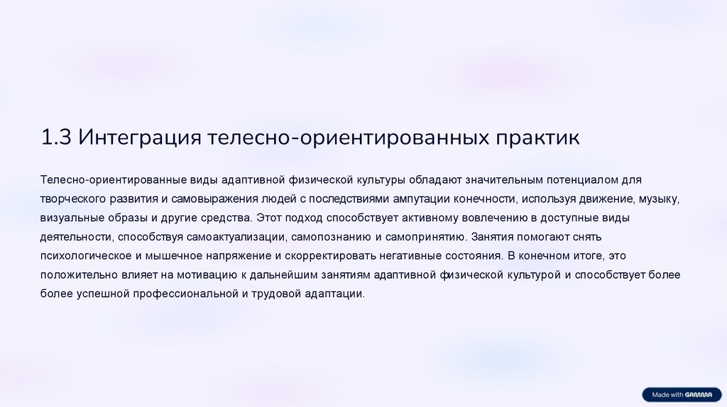 1.3 Интеграция телесно-ориентированных практикТелесно-ориентированные виды адаптивной физической культуры обладают значительным потенциалом для