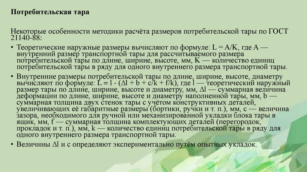 Потребительская тараНекоторые особенности методики расчёта размеров потребительской тары по ГОСТ