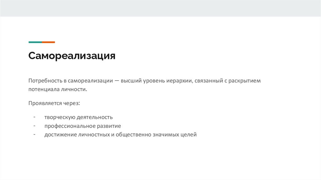 СамореализацияПотребность в самореализации — высший уровень иерархии, связанный с раскрытием