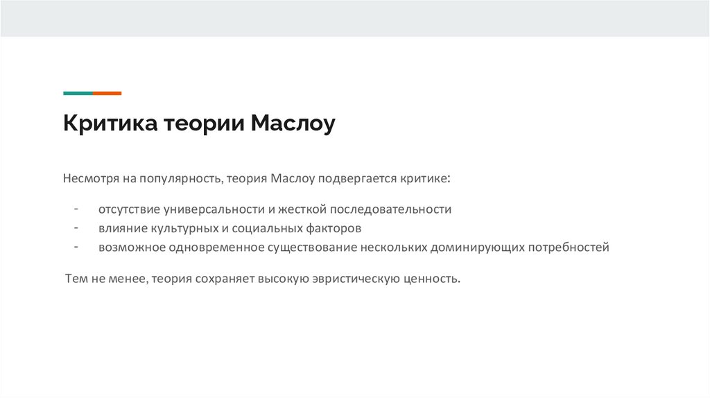Критика теории МаслоуНесмотря на популярность, теория Маслоу подвергается критике: