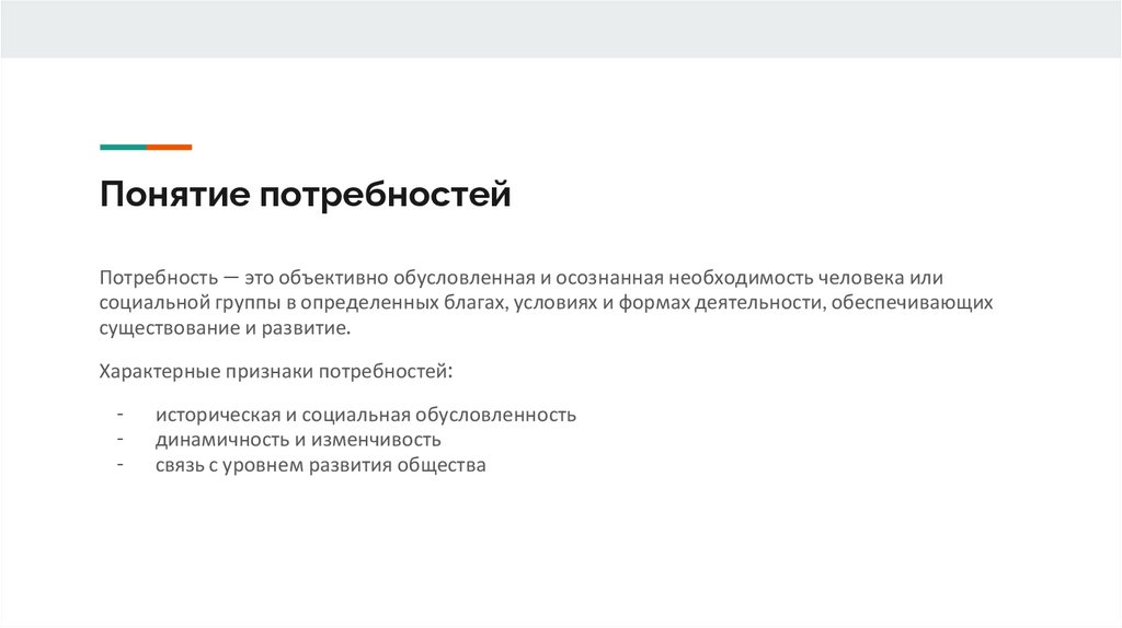 Понятие потребностейПотребность — это объективно обусловленная и осознанная необходимость человека или