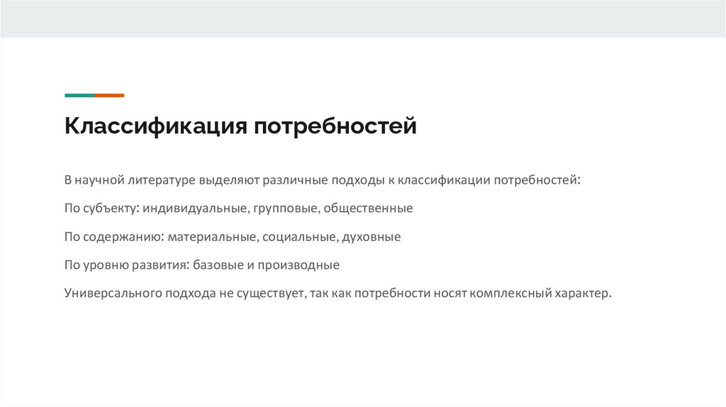Классификация потребностейВ научной литературе выделяют различные подходы к классификации потребностей: