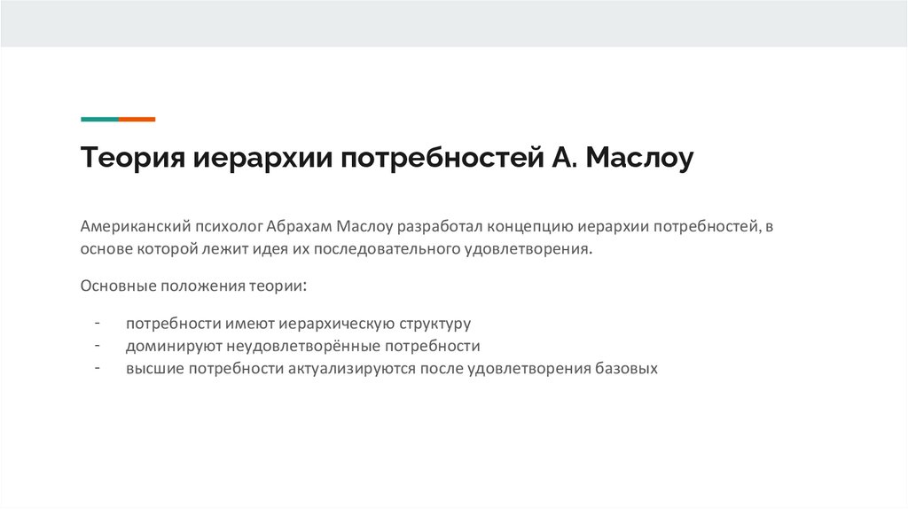 Теория иерархии потребностей А. МаслоуАмериканский психолог Абрахам Маслоу разработал концепцию иерархии потребностей, в