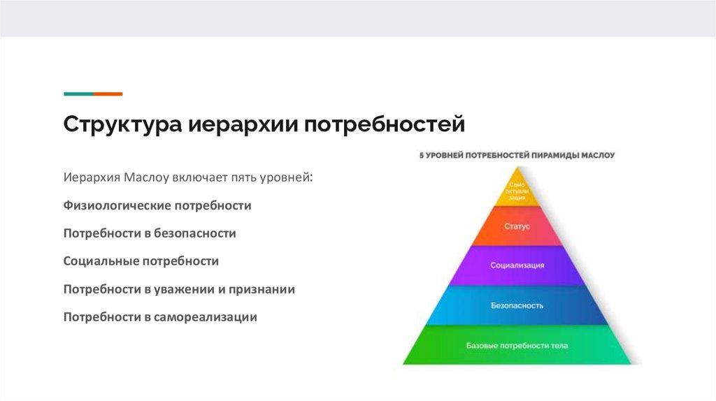 Структура иерархии потребностейИерархия Маслоу включает пять уровней: