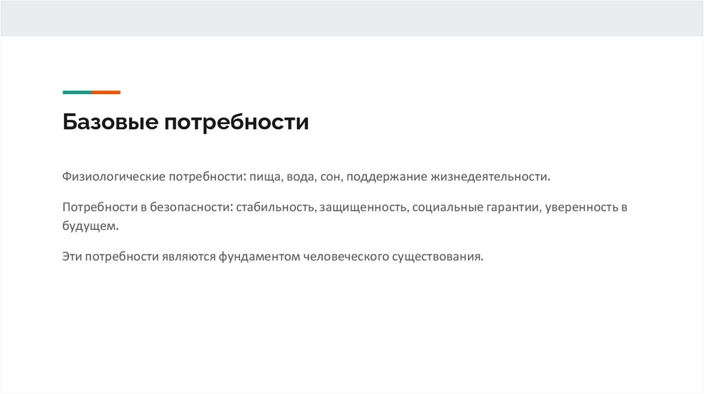 Базовые потребностиФизиологические потребности: пища, вода, сон, поддержание жизнедеятельности.