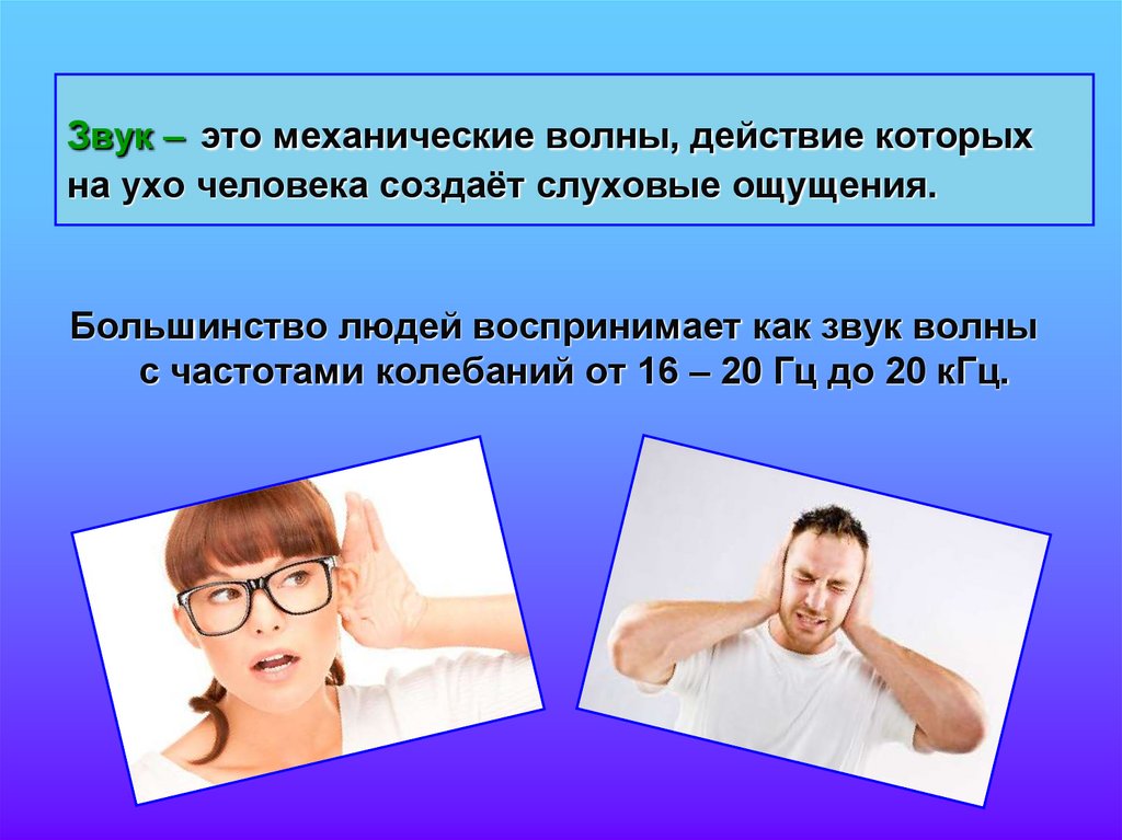 1. Звук – это механические волны, действие которых на ухо человека создаёт слуховые ощущения.