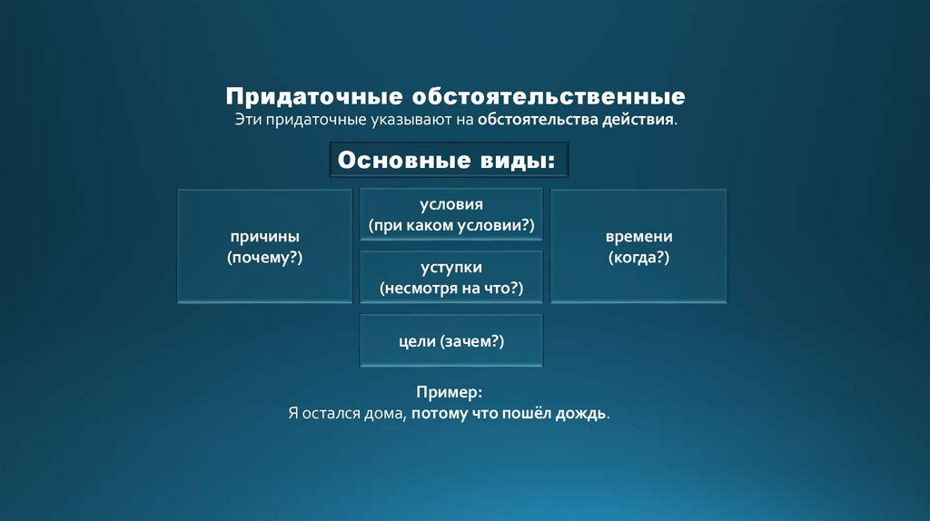 Придаточные обстоятельственныеЭти придаточные указывают на обстоятельства действия.