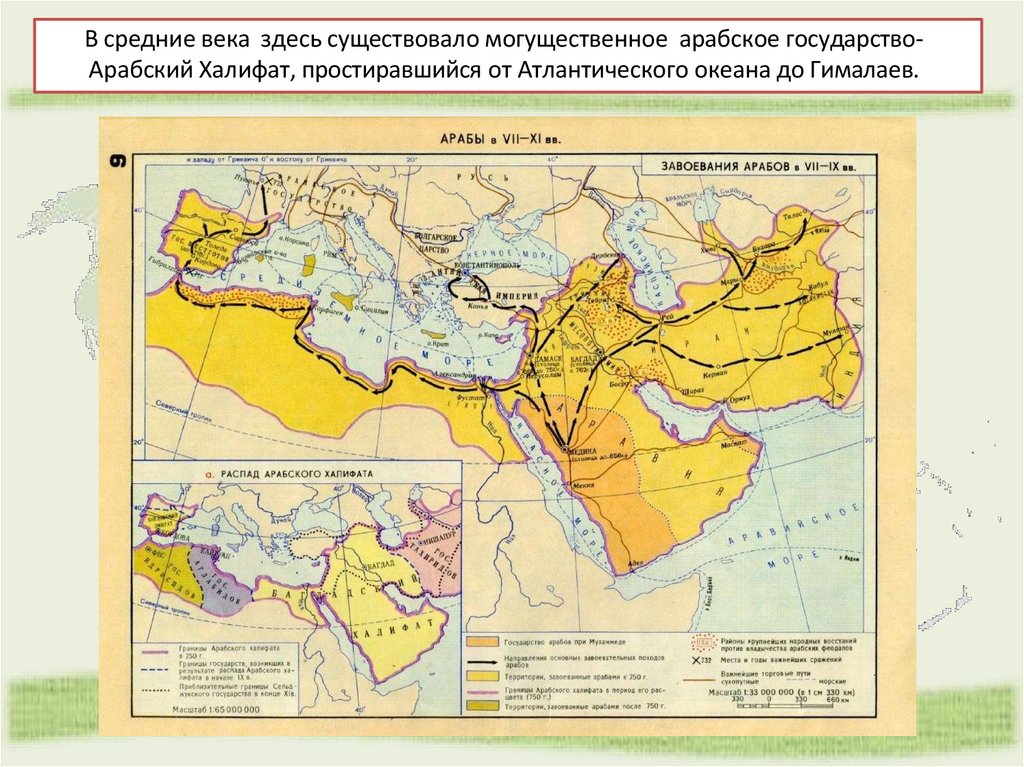 В средние века здесь существовало могущественное арабское государствоАрабский Халифат, простиравшийся от Атлантического океана до Гималаев.15.