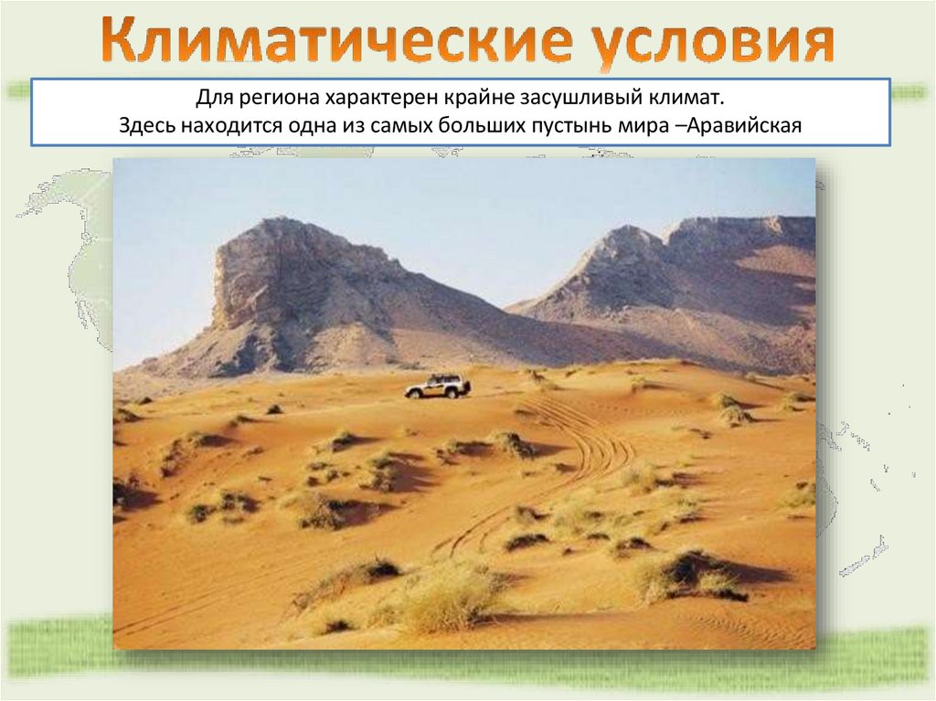 Для региона характерен крайне засушливый климат.Здесь находится одна из самых больших пустынь мира –Аравийская