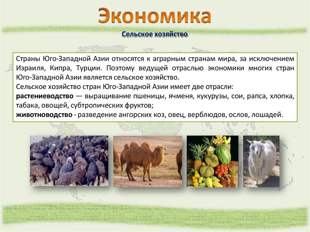 Сельское хозяйствоСтраны Юго-Западной Азии относятся к аграрным странам мира, за исключением