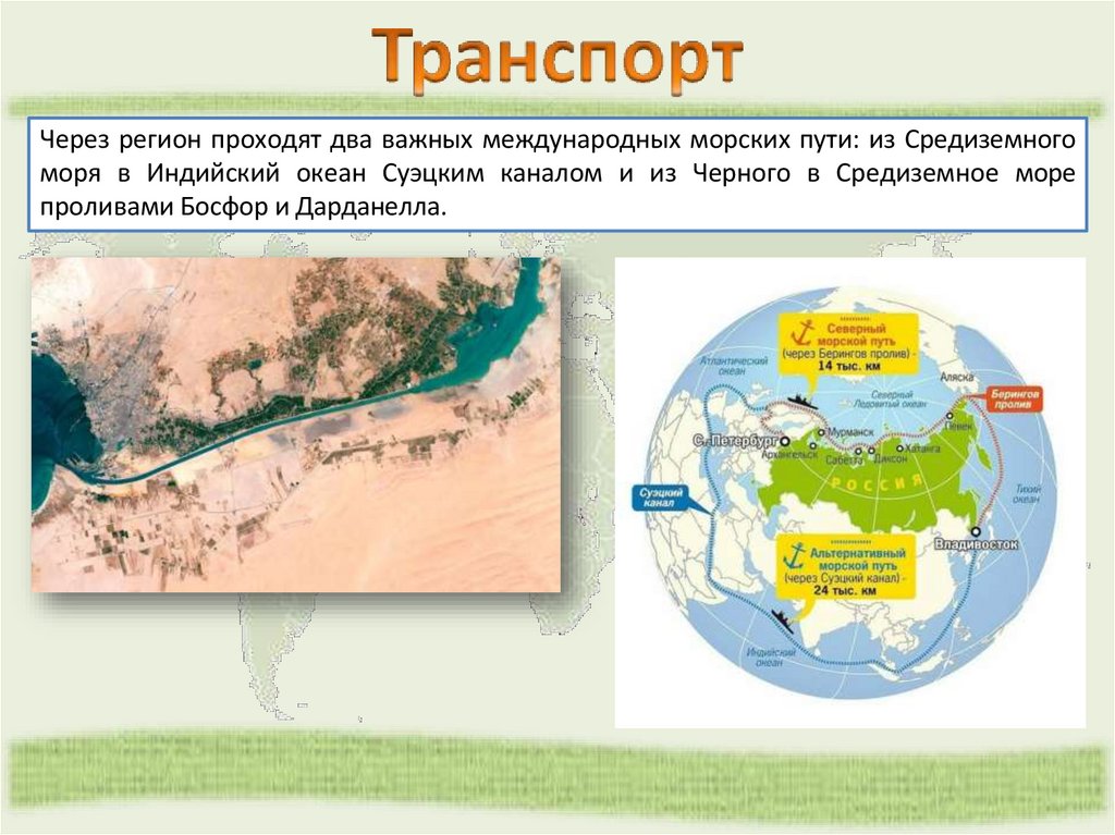 Через регион проходят два важных международных морских пути: из Средиземногоморя в Индийский океан Суэцким каналом и из Черного в Средиземное море