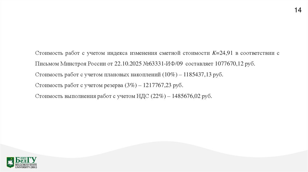 14Стоимость работ с учетом индекса изменения сметной стоимости K=24,91 в соответствии с