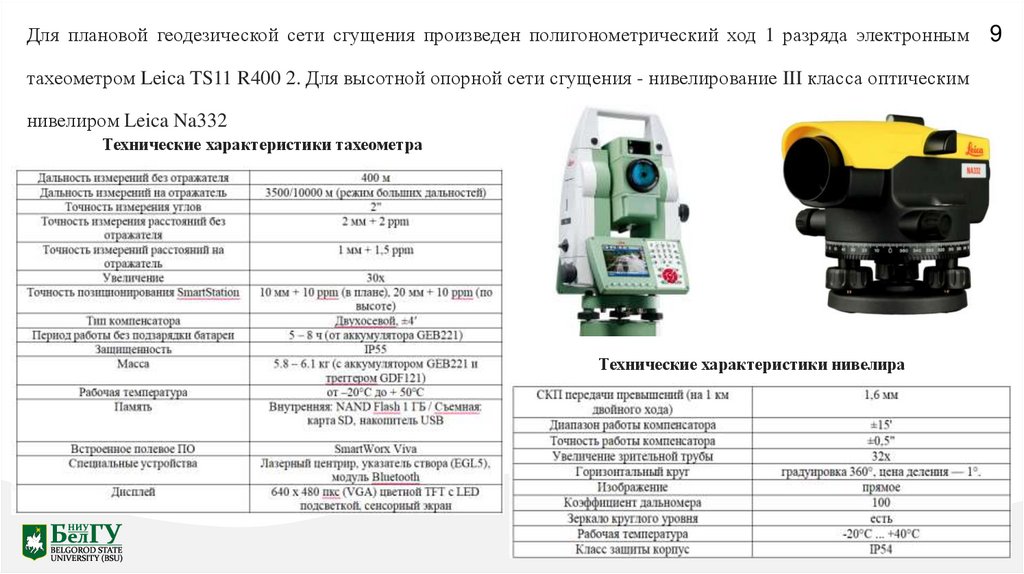 Для плановой геодезической сети сгущения произведен полигонометрический ход 1 разряда электроннымтахеометром Leica TS11 R400 2. Для высотной опорной сети сгущения - нивелирование III класса оптическим