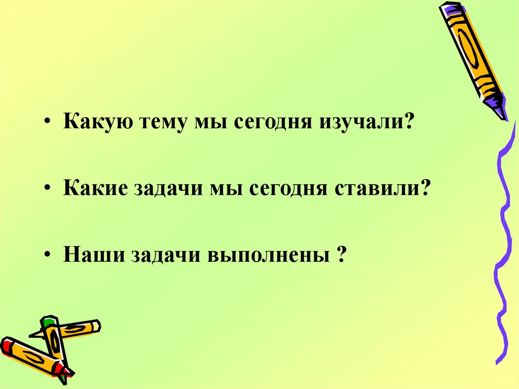 • Какую тему мы сегодня изучали?• Какие задачи мы сегодня ставили?