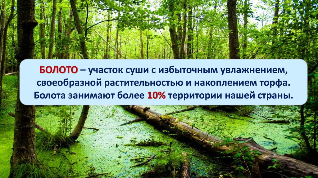БОЛОТО – участок суши с избыточным увлажнением,своеобразной растительностью и накоплением торфа.