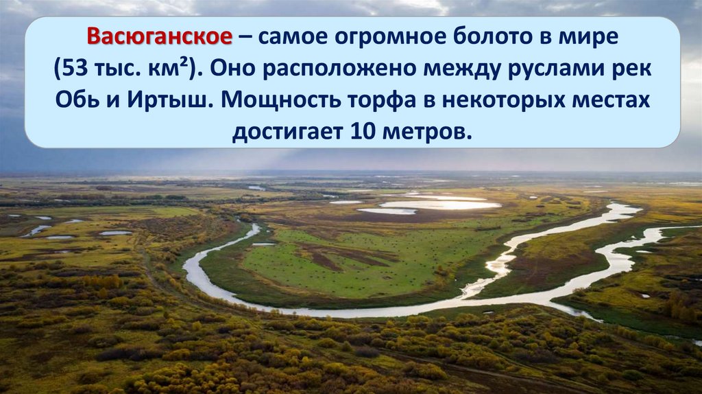Васюганское – самое огромное болото в мире(53 тыс. км²). Оно расположено между руслами рек