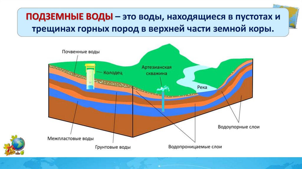 ПОДЗЕМНЫЕ ВОДЫ – это воды, находящиеся в пустотах итрещинах горных пород в верхней части земной коры.