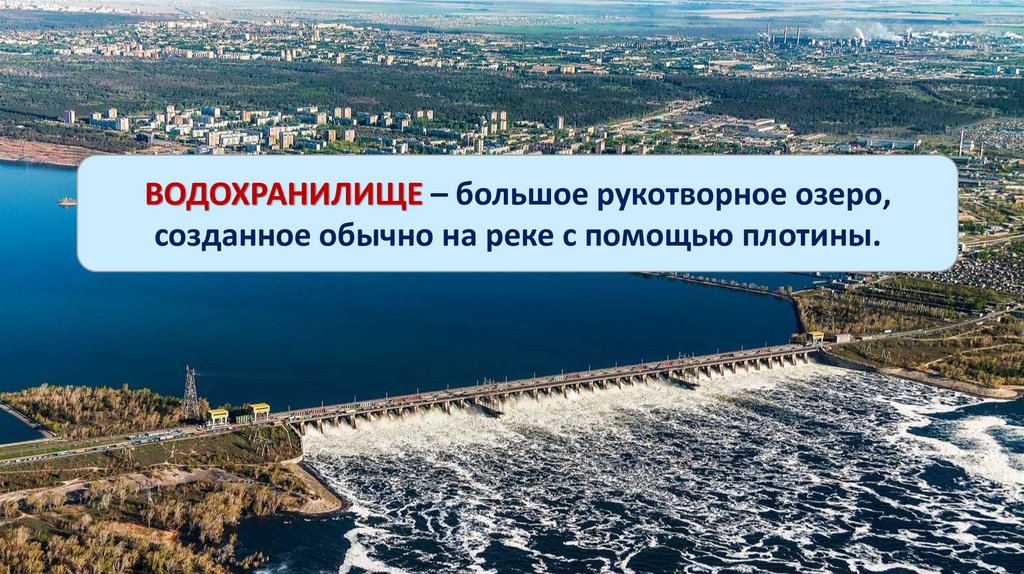 ВОДОХРАНИЛИЩЕ – большое рукотворное озеро,созданное обычно на реке с помощью плотины.