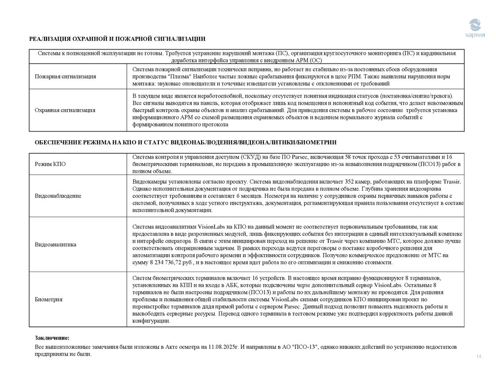 РЕАЛИЗАЦИЯ ОХРАННОЙ И ПОЖАРНОЙ СИГНАЛИЗАЦИИСистемы к полноценной эксплуатации не готовы. Требуется устранение нарушений монтажа (ПС), организация круглосуточного мониторинга (ПС) и кардинальная