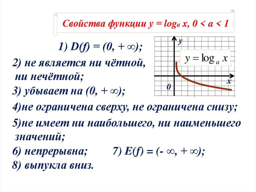 Свойства функции у = loga x, 0 < a < 1у