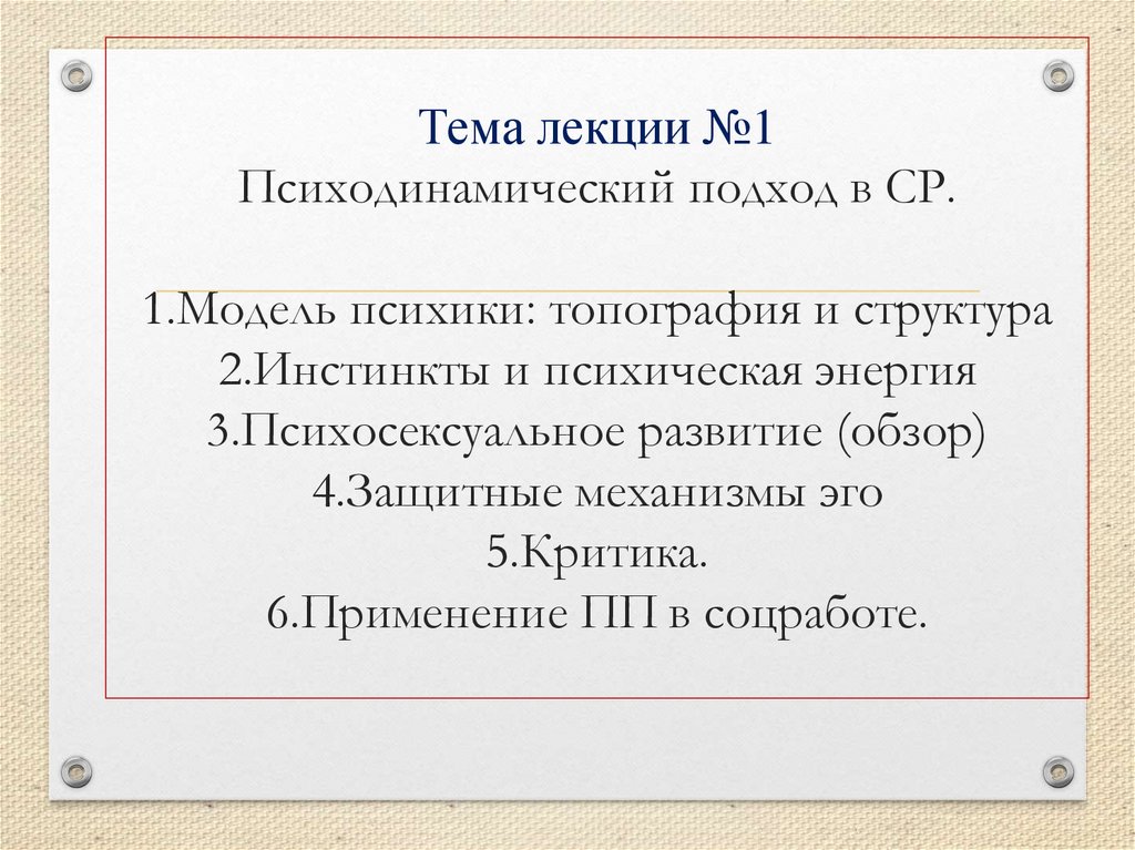 1. Тема лекции №1 Психодинамический подход в СР. 1.Модель психики: топография и структура 2.Инстинкты и психическая энергия