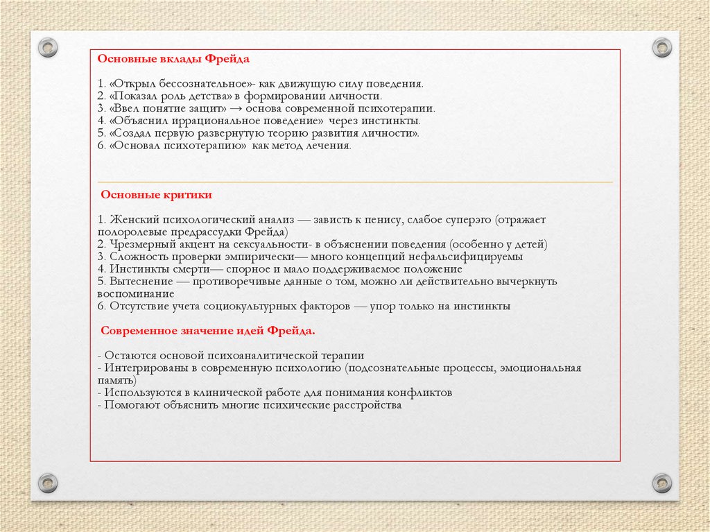 Основные вклады Фрейда1. «Открыл бессознательное»- как движущую силу поведения.