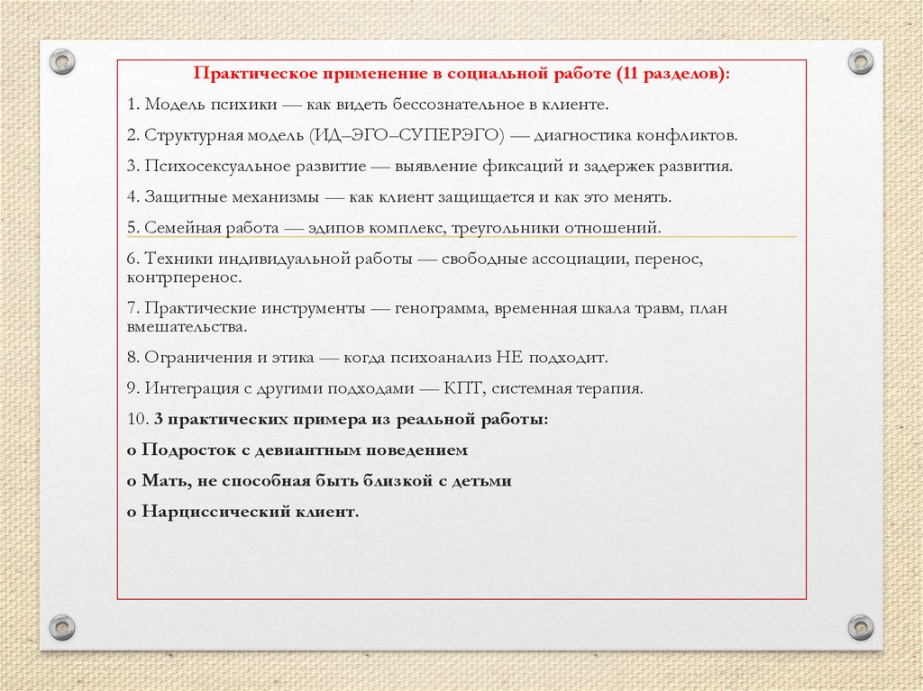 Практическое применение в социальной работе (11 разделов):1. Модель психики — как видеть бессознательное в клиенте.