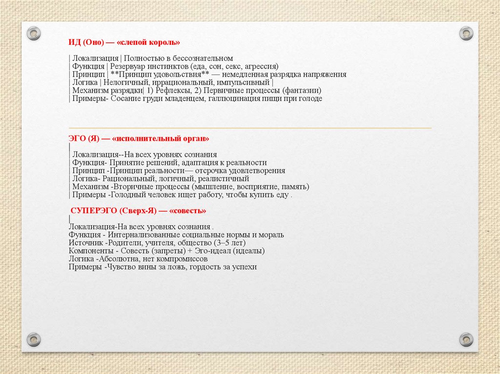 ИД (Оно) — «слепой король»| Локализация | Полностью в бессознательном