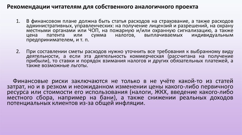 В финансовом плане должна быть статья расходов на страхование, а также расходов