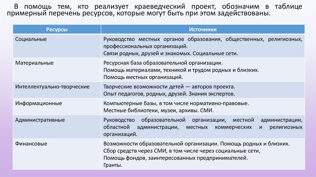 В помощь тем, кто реализует краеведческий проект, обозначим в таблицепримерный перечень ресурсов, которые могут быть при этом задействованы.