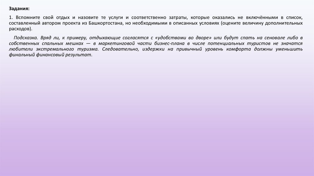Задания:1. Вспомните свой отдых и назовите те услуги и соответственно затраты, которые оказались не включёнными в список,