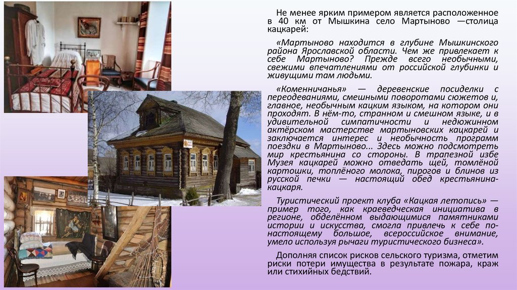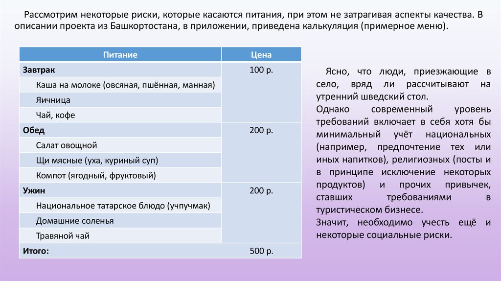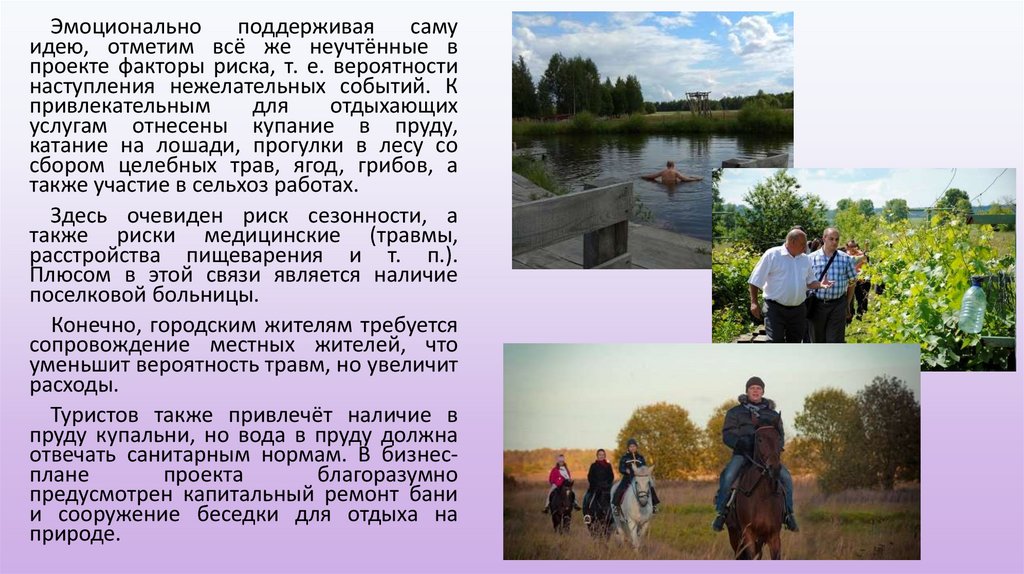 Отдавая должное любви школьников к родным местам и стремлению к их развитию, отметим, что в рамках полномасштабной туристическойдеятельности организационные задачи и риски для тех, кто задумал проект, так же как и их расчёты и сметы, будут гораздо более сложными.