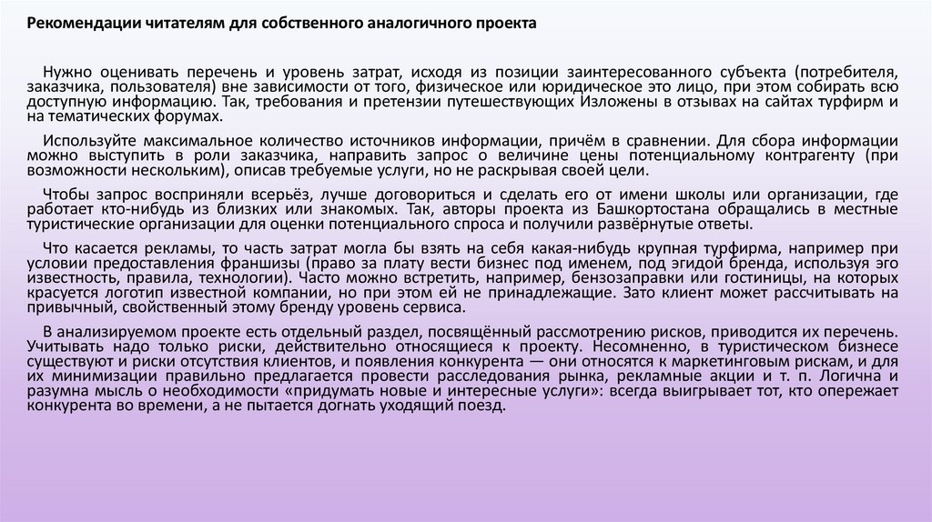 Встречаются проекты, авторы которых стремятся расчётами доказать сравнительные преимущества проекта отечественного тура перед заграничным.