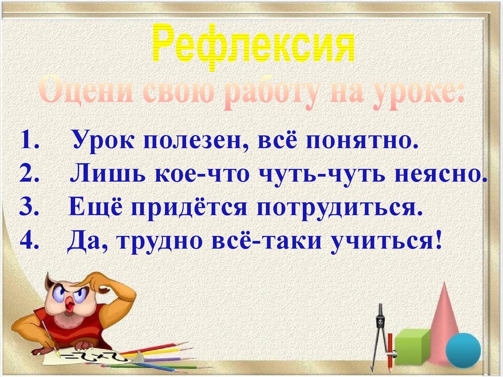 1. Урок полезен, всё понятно.2. Лишь кое-что чуть-чуть неясно.